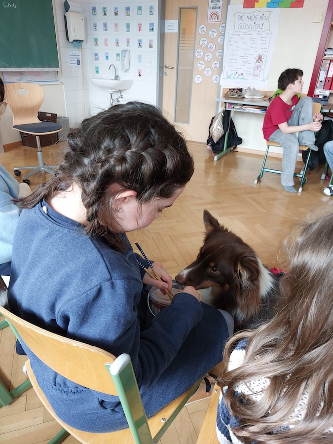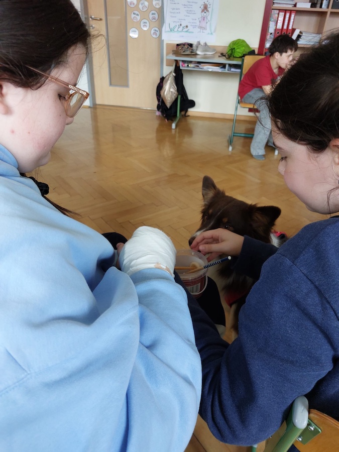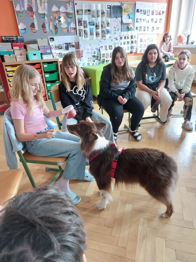 Die Schülerinnen und Schüler durften Milo auch selbst füttern und erhielten dabei viele Informationen zum richtigen Umgang mit Hunden. Der Besuch war für alle spannend, lehrreich und machte großen Spaß.